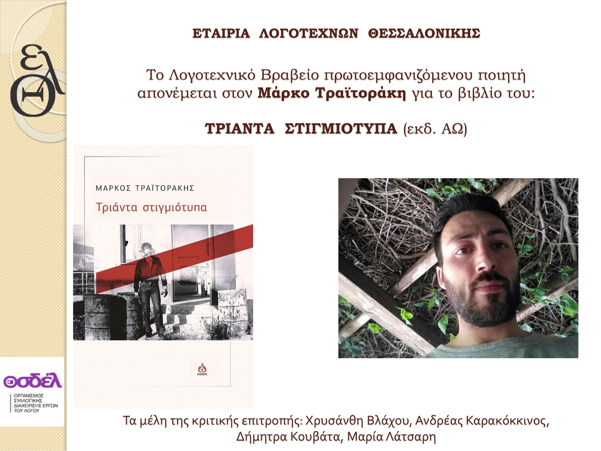 Πρωτοεμφανιζόμενου Ποιητή στον Μάρκο Τραϊτοράκη για την πρώτη του συλλογή Τριάντα στιγμιότυπα, που κυκλοφορεί από τις ΑΩ Εκδόσεις