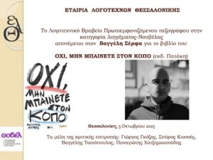 06 Οκτ Η Εταιρία Λογοτεχνών Θεσσαλονίκης απένειμε τα εξής βραβεία: α) σε προσωπικότητα του λογοτεχνικού χώρου β) σε πρωτοεμφανιζόμενους λογοτέχνες με έργα που εκδόθηκαν το 2024.