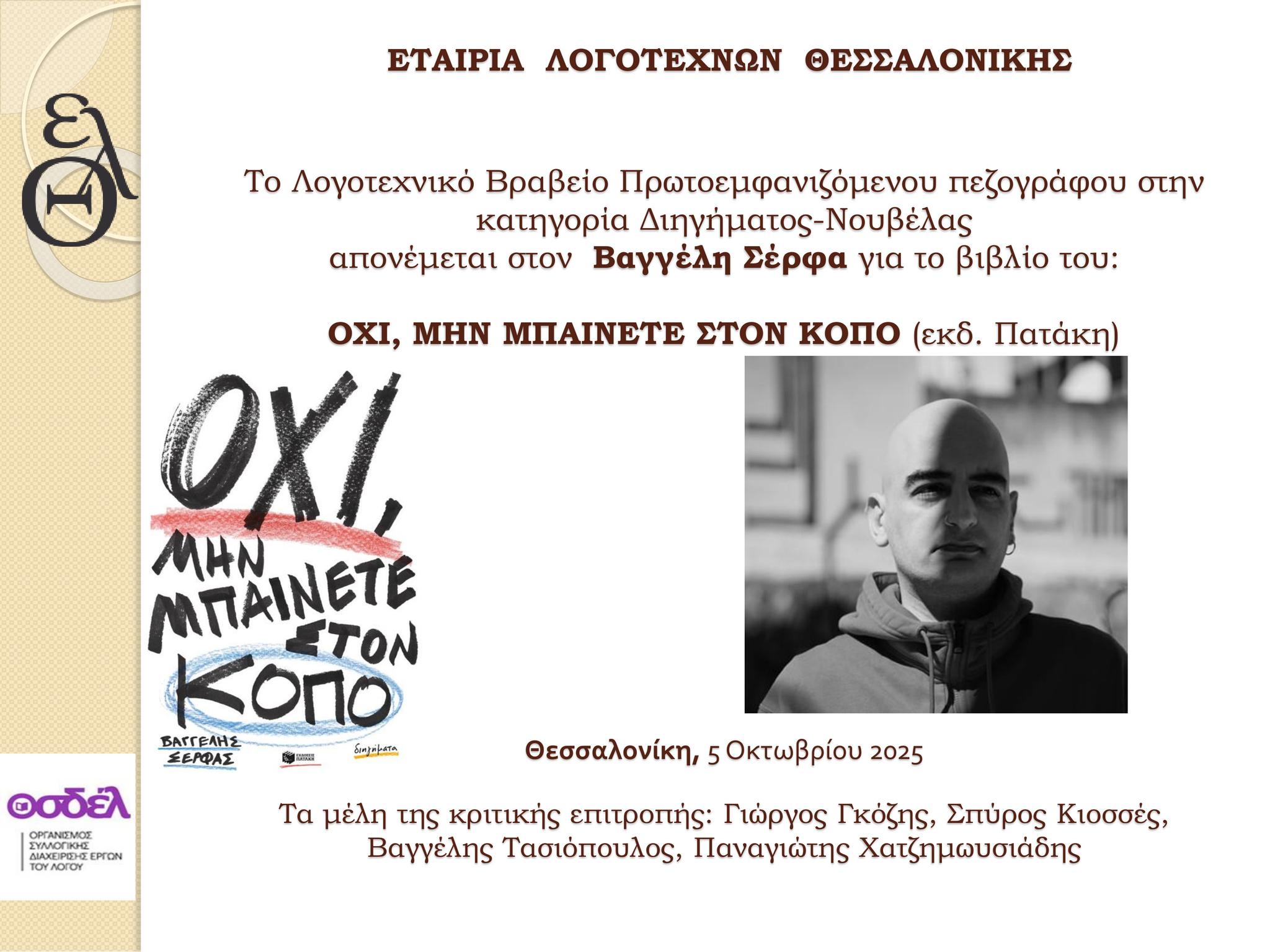 Τα μέλη της κριτικής επιτροπής – με αλφαβητική σειρά: Γιώργος Γκόζης, Σπύρος Κιοσσές, Βαγγέλης Τασιόπουλος και Παναγιώτης Χατζημωυσιάδης – ανέγνωσαν, επέλεξαν, συναντήθηκαν, πρόκριναν, επιχειρηματολόγησαν και τελικά κατέληξαν: η ΕΛΘ απονέμει ομόφωνα το βραβείο πρωτοεμφανιζόμενου συγγραφέα διηγήματος 2024 στη συλλογή ΟΧΙ, ΜΗΝ ΜΠΑΙΝΕΤΕ ΣΤΟΝ ΚΟΠΟ του Βαγγέλη Σέρφα, που κυκλοφορεί από τις Εκδόσεις Πατάκη-Patakis Publishers.
