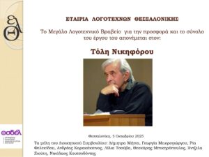 Η Εταιρία Λογοτεχνών Θεσσαλονίκης απονέμει φέτος το Βραβείο