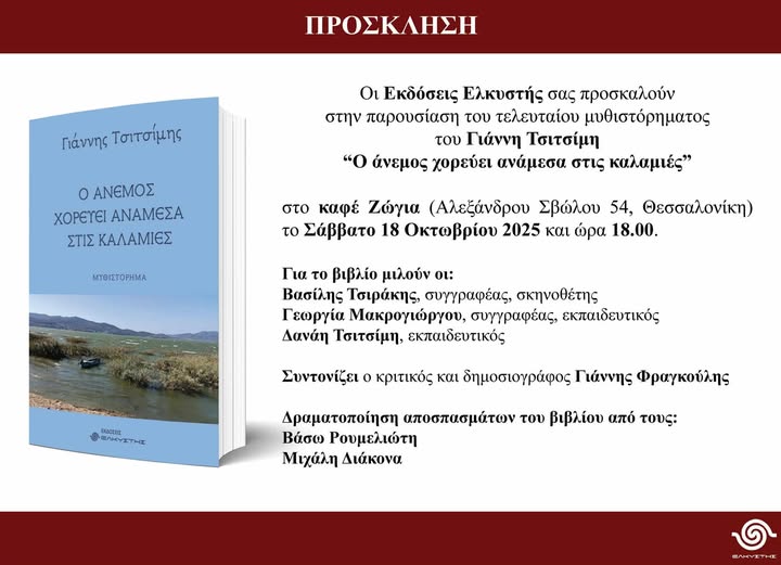 11 Οκτ Παρουσίαση του νέου βιβλίου του Γιάννη Τσιτσίμη το Σάββατο 18 Οκτωβρίου, ώρα 18.00 στη Ζώγια Posted at 11:08h in Νέα των μελών by Εταιρία Λογοτεχνών Θεσσαλονίκης Share Το Σάββατο 18 Οκτωβρίου, ώρα 18.00 στη Ζώγια, η παρουσίαση του νέου βιβλίου του Γιάννη Τσιτσίμη Tags: Ανακοινώσεις