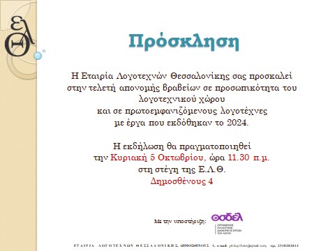 Η Εταιρία Λογοτεχνών Θεσσαλονίκης σας προσκαλεί στην τελετή απονομής λογοτεχνικών βραβείων